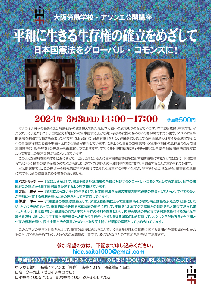 | ■2024年3月3日開催 大阪労働学校・アソシエ公開講座『平和に生きる生存権の確立をめざして―日本国憲法をグローバル・コモンズに!』>>>動画はこちら | |||