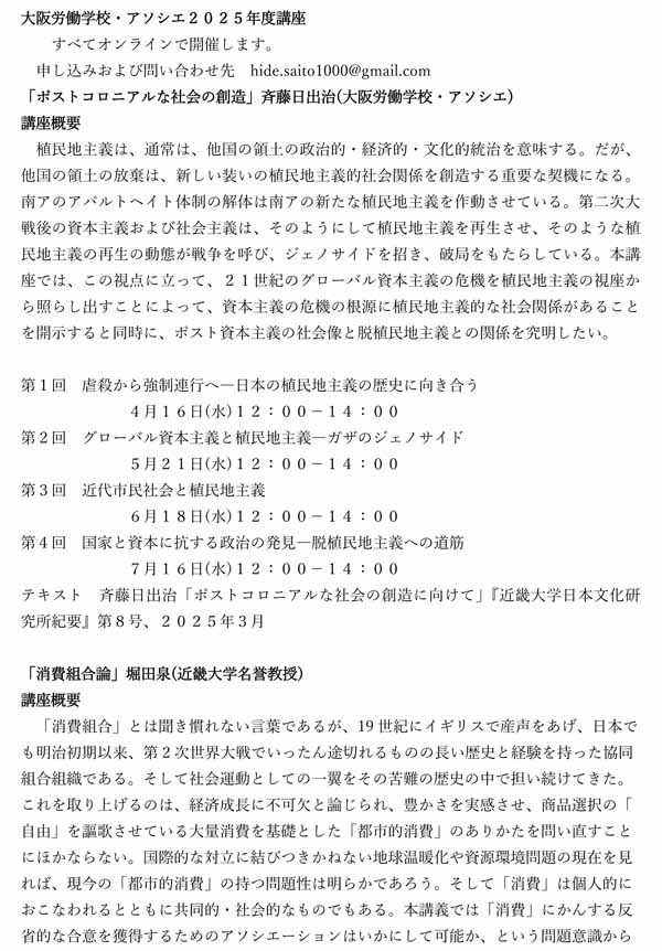 ■2024年3月3日開催 大阪労働学校・アソシエ公開講座『平和に生きる生存権の確立をめざして―日本国憲法をグローバル・コモンズに!』のチラシ(写真クリックでPDFファイルが開きます。)![]() |